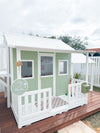 Our cubbies are painted with a temporary water-based stain. Please note: stained water based colours may differ or change. We recommend painting your cubby house with two coats of primer and two coats of a durable outdoor paint from Taubmans for longevity, within 4 weeks of outdoor use. The Delightful Shack come sin Grey/White and Wood Look Colour as pictured.