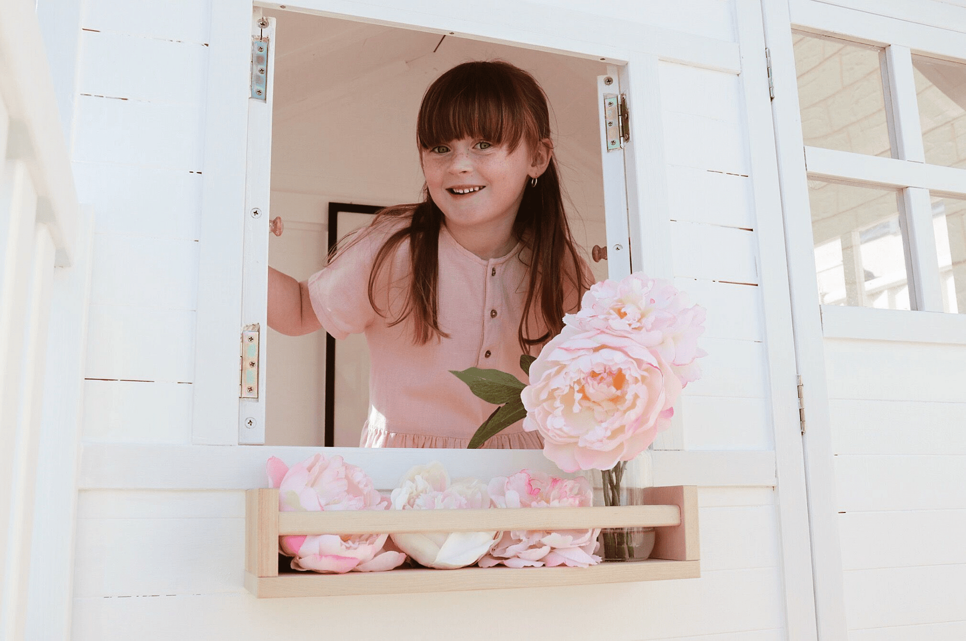 Our cubbies are painted with a temporary water-based stain. The Inspiration Shack is supplied in a wood look/white water based stain as shown in the images. Please note: stained water based colours may differ or change. We recommend painting your cubby house with two coats of primer and two coats of a durable outdoor paint from Taubmans for longevity, within 4 weeks of outdoor use.