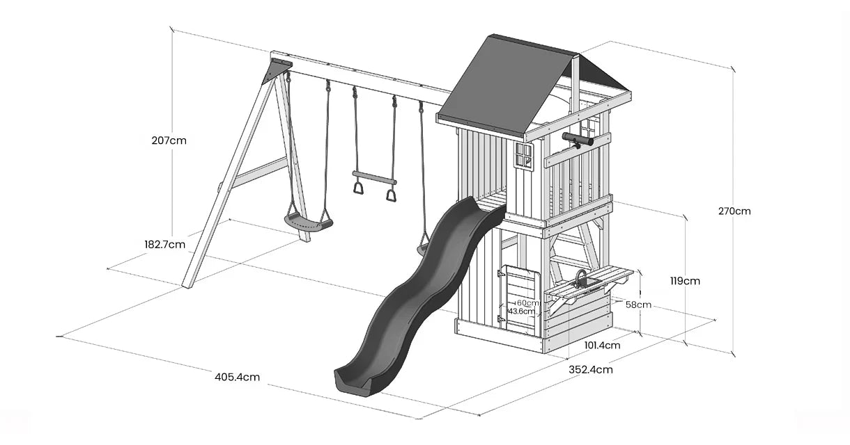 The Montrose Play Centre Set offers a fantastic backyard adventure for Aussie kids, featuring a 2.2m wavy slide, a 3-position swing beam with two swings and a trapeze and an upper play fort with a telescope and windows. Designed with a ladder for easy access to the upper fort and a downstairs area complete with a door, window and play kitchen, this play centre is perfect for imaginative and active play. Rigorously tested to meet Australian Standards, the Montrose Play Centre is designed for safety and long-lasting enjoyment for Aussie kids.
