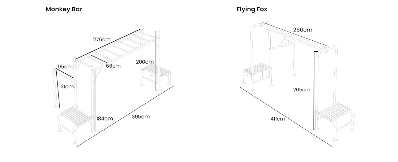 Our flying fox paired with monkey bars offer a variety of activities for your little one. Our 2.6m flying fox is the ultimate backyard play equipment. Your little ones can experience the thrill of zipping through the air at full speed. The Classic Playground Monkey Bars are the most fun for little ones. Our 2.7m long monkey bars provide lots of room for your little one and their friends.