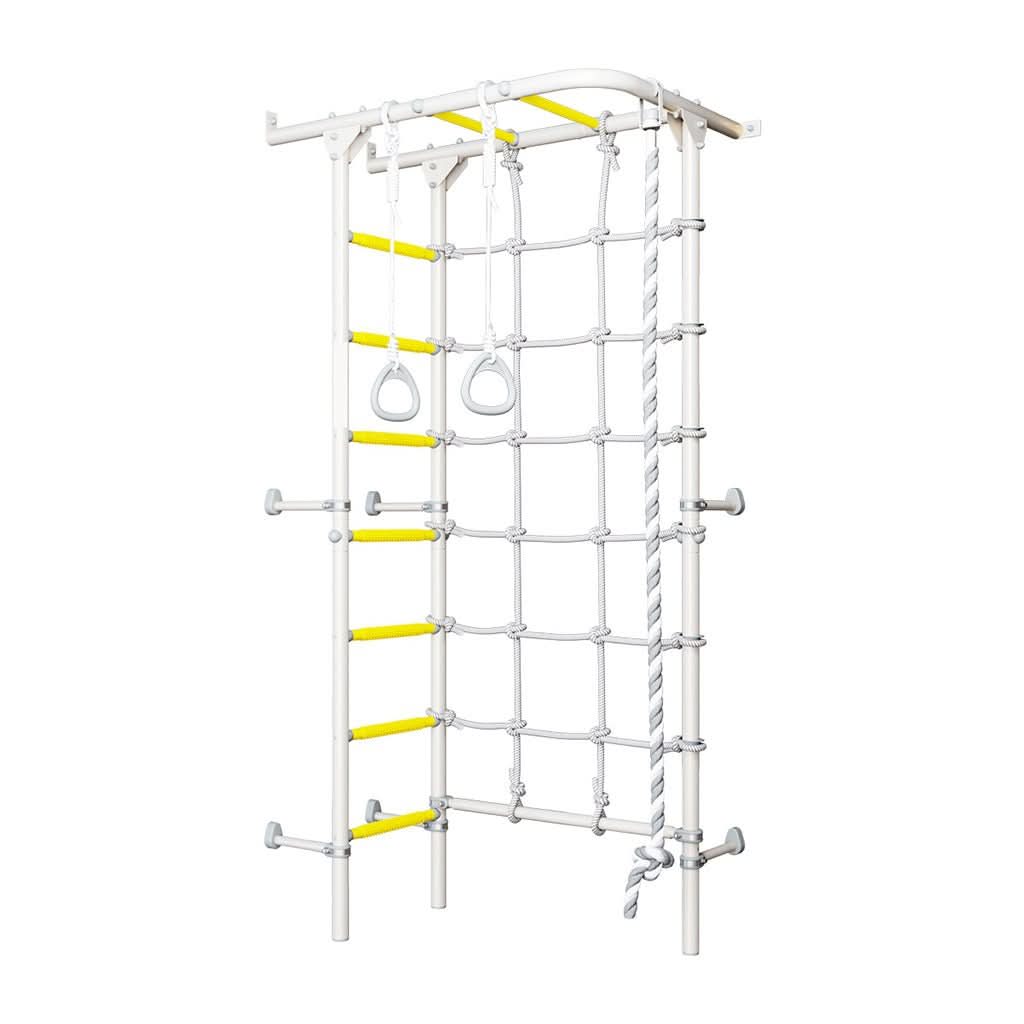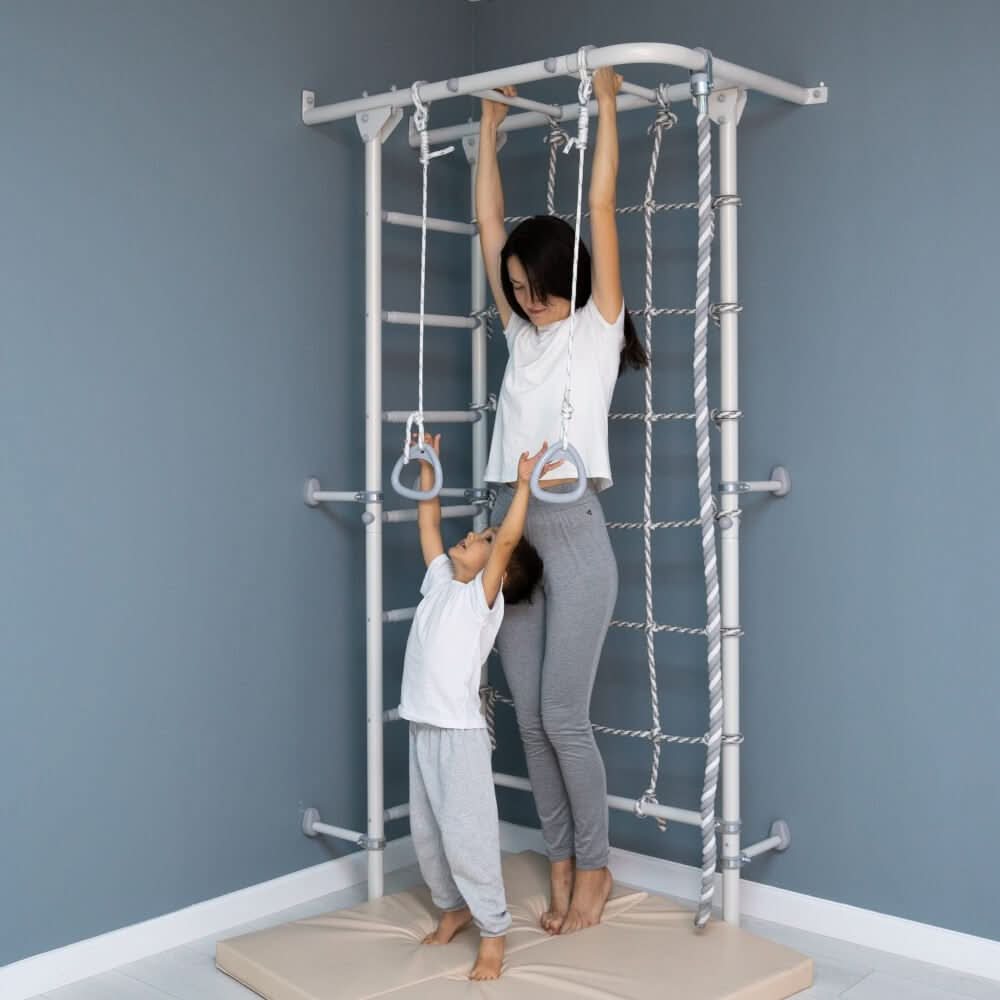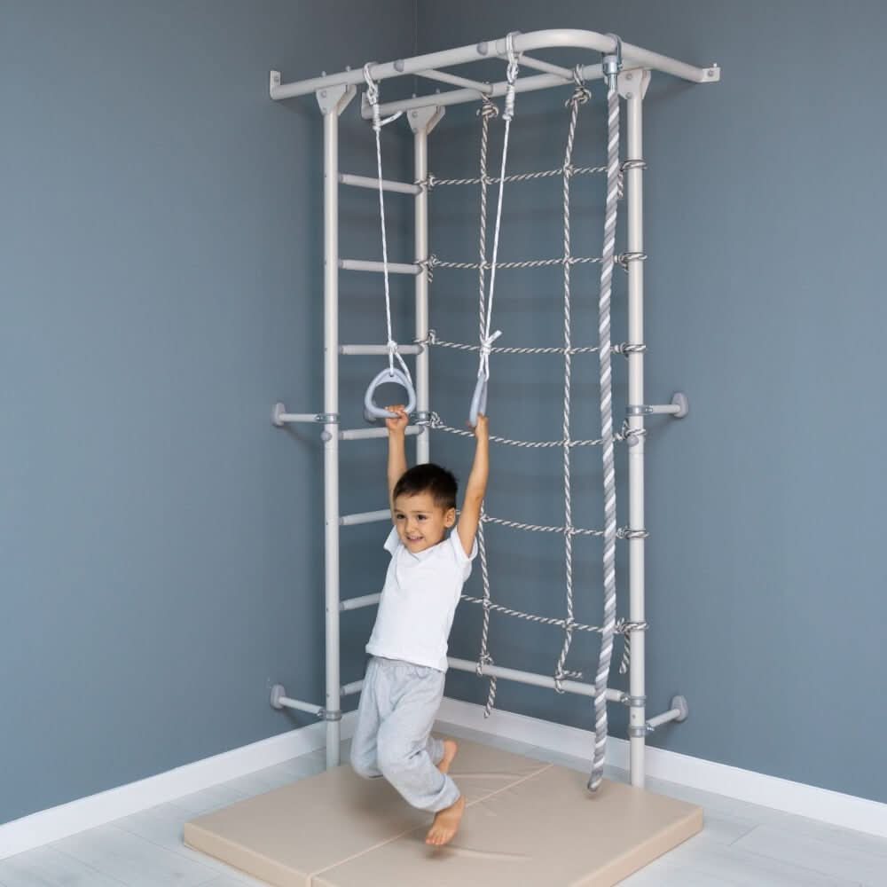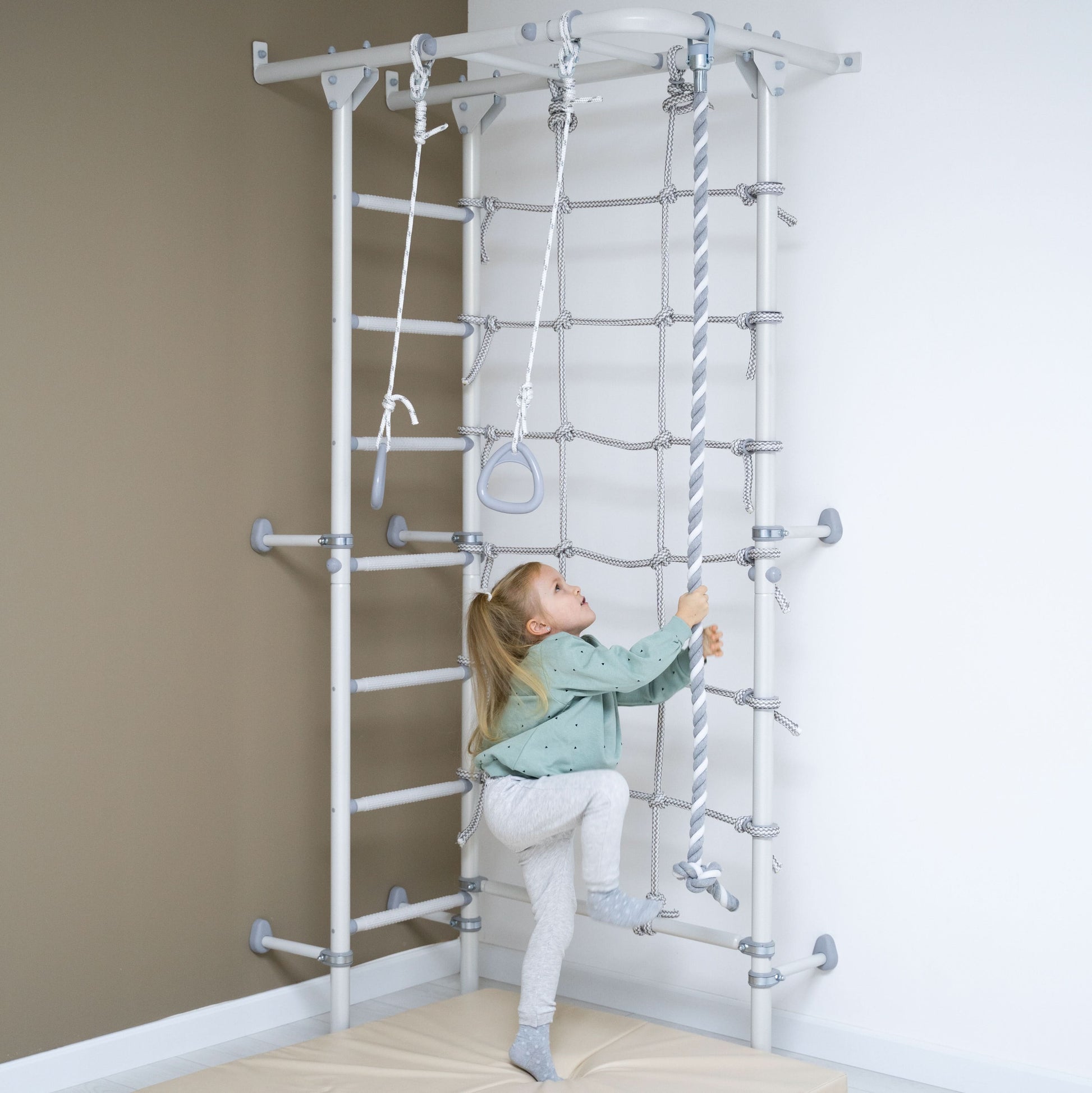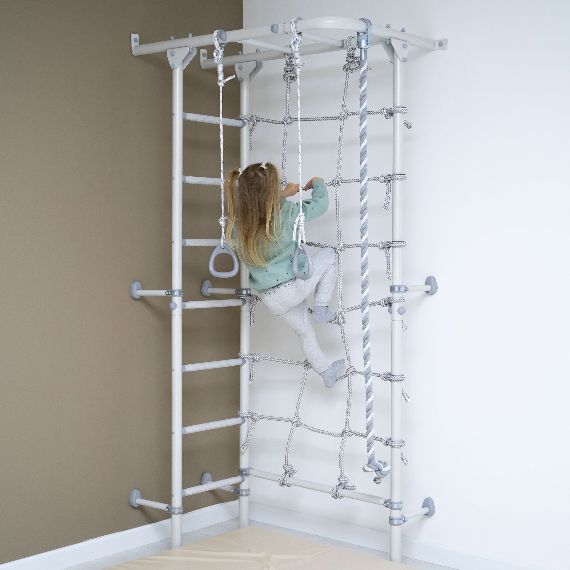 Swedish Corner Wallbars - S4 is a climbing frame for corner walls, designed specifically for homes or centres where space is a constraint. This playset comes with monkey bars, massage effect ladders to climb on, a rope climber, gymnastics rings and a spider net. The overall structure can withstand a weight of up to 100 kg (test load - 200 kg).