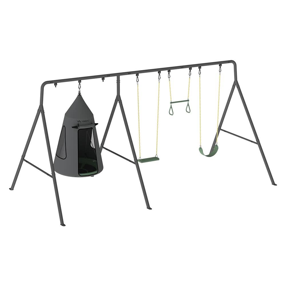 Sporting a sleek, contemporary design, the gobaplay Ultimate Discovery swing set promises durability. Constructed from robust powder-coated steel and backed by a 5-year warranty, it's sure to outshine the lifespan of many conventional outdoor swing sets.